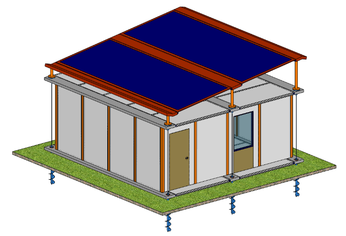 Das Modulhaus System ist eine simple Nut- und Feder-konstruktion auf Steck- und Klippbasis, die mit Spannelementen zwischen der Boden- und der Deckenpaneelen und den Erdankern (Schraubpfahlfundamenten) gesichert wird.