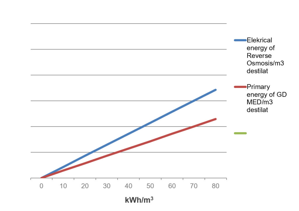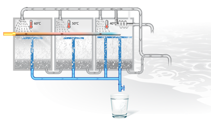 GD units desalinate high salt concentration intake water. Unlike other solutions the energy demand is independent of the raw water quality. Treatment of contaminated water and brine (8 % salinity) works without rising operations expenses. Outstanding energy efficiency of the GD process due to cascading heat utilization minimizes the daily running costs.