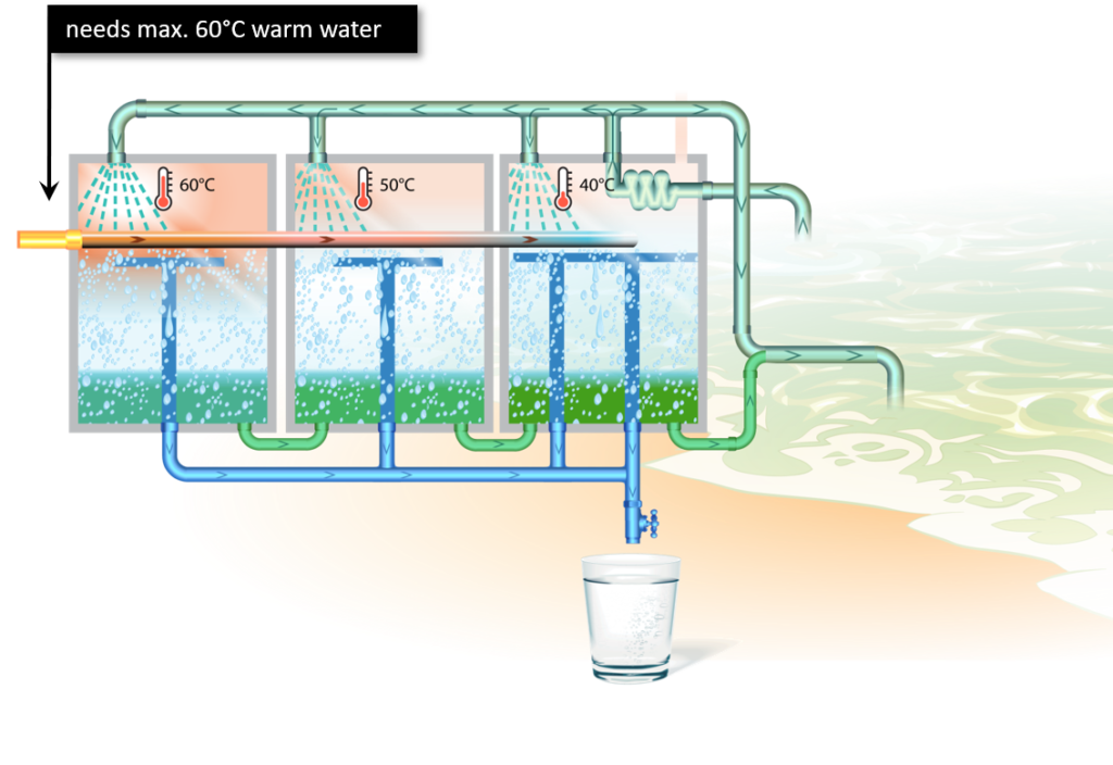 By using the waste heat from power generation to clean contaminated water close to 95 % of the primary energy input (fuel, gas …) will be used for combined power and water production. Besides CHP solutions all kinds of waste heat (cooling process, industrialprocesses…) can be used as driving force for the process.